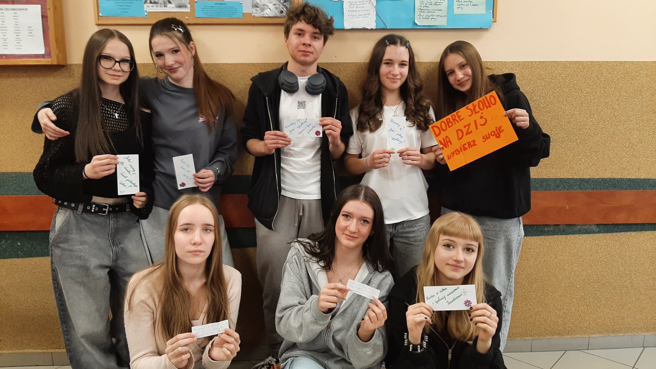 Stworzyliśmy kartki z miłymi sformułowaniami, rozdaliśmy je obok szkoły ;)...