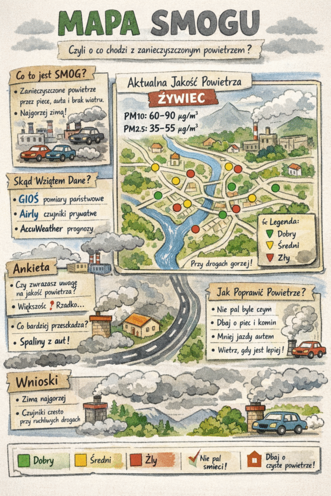 1.Smog to po prostu zanieczyszczone powietrze – takie, którym się średnio chce oddychać. Najczęściej pojawia się zimą, jak ludzie palą w piecach, ale też przez samochody i brak wiatru. Nie jest to nic nowego, tylko teraz więcej się o tym mówi i są czujniki, które to pokazują.