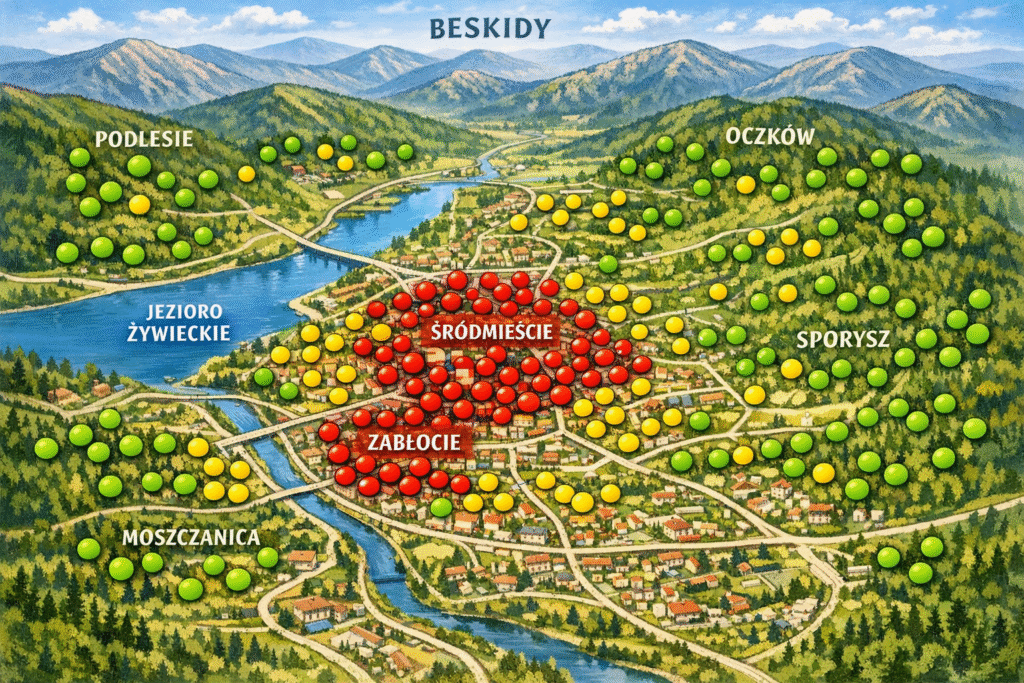 Najgorzej jest zimą – to widać po liczbach. Jak nie ma wiatru, to wszystko stoi w miejscu i robi się gorzej. Czujniki często są ustawione przy drogach albo w “ciasnych” miejscach, więc wyniki mogą być trochę podkręcone. W praktyce w jednej części miejscowości może być gorzej, a kawałek dalej już spoko.