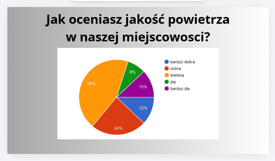 Przeprowadziliśmy lokalną kampanię informacyjną dotyczącą jakości powietrza i problemu smogu. Korzystając z aplikacji takich jak Canva oraz Gogle forms, sprawdziliśmy aktualny stan powietrza w naszej okolicy.