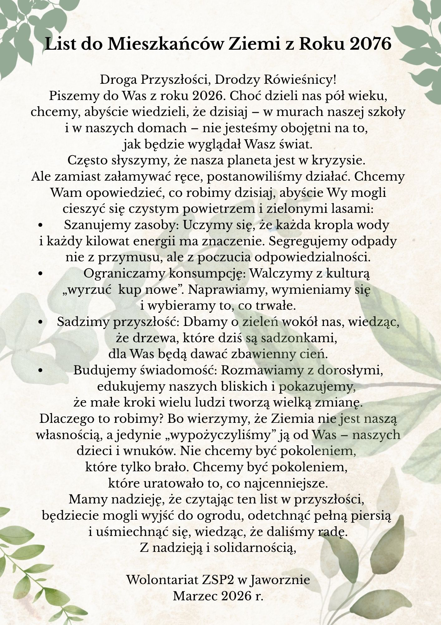 Naszej drużynie wolontariatu szkolnego nadaliśmy nazwę TOGETHER, gdyż RAZEM chcemy pomagać innym i tworzyć lepszy świat. Nasza drużyna składa się z 10 osób z różnych klas Zespołu Szkół Ponadpodstawowych nr 2 w Jaworznie.
