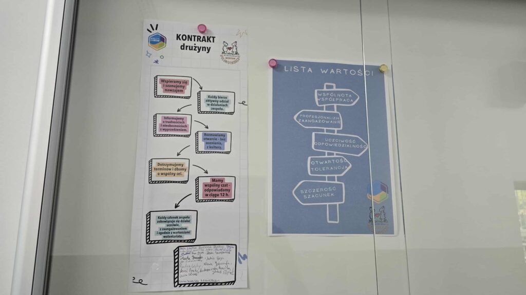 Na przygotowanym przez nas plakacie zapisaliśmy wspólnie wybrane wartości – m.in. wzajemny szacunek, odpowiedzialność, zaufanie, otwartość i współpracę. Plakat zawisł obok naszego kontraktu drużynowego, tak by codziennie przypominał nam o tym, co jest dla nas najważniejsze.