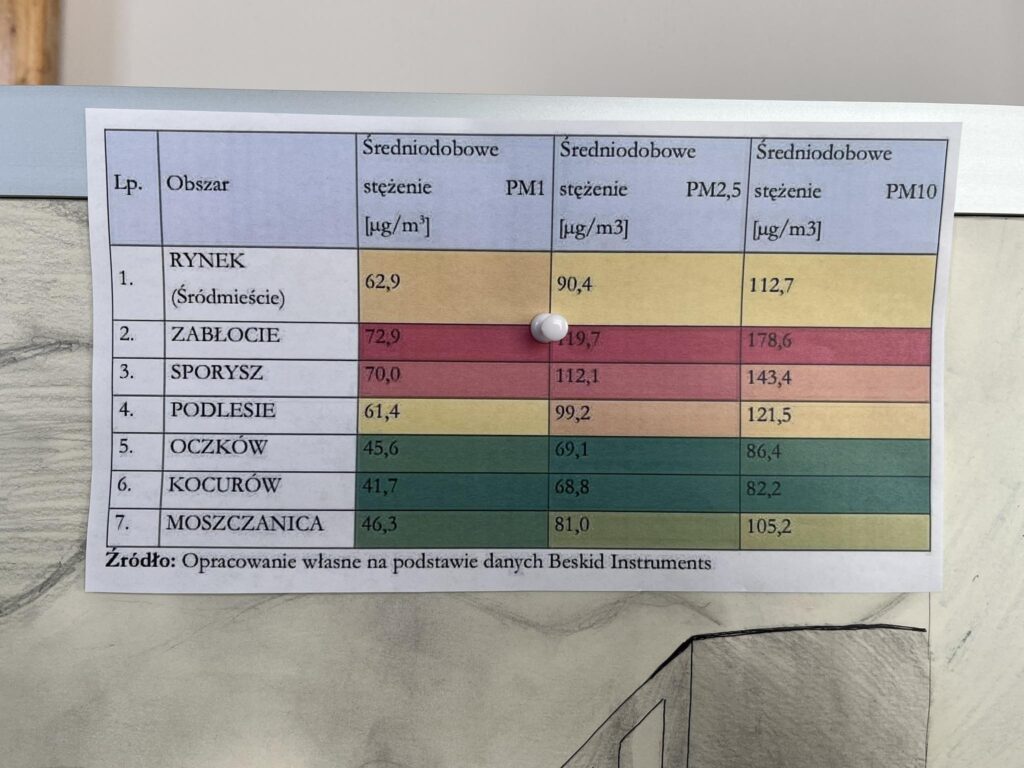 ​Analiza danych: Zebraliśmy i zestawiliśmy dane o stężeniach PM1, PM2,5 oraz PM10 z siedmiu obszarów (m.in. Rynek, Zabłocie, Moszczanica), korzystając z danych Beskid Instruments i GIOŚ.