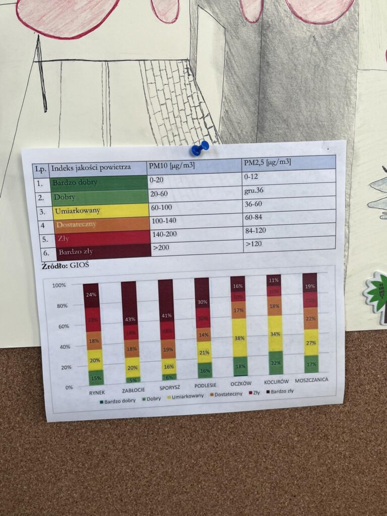 ​Kampania informacyjna: Stworzyliśmy gazetkę ścienną „Działanie Smogu” z autorskimi infografikami, mapami i wykresami, która zawisła w przestrzeni publicznej/szkolnej.