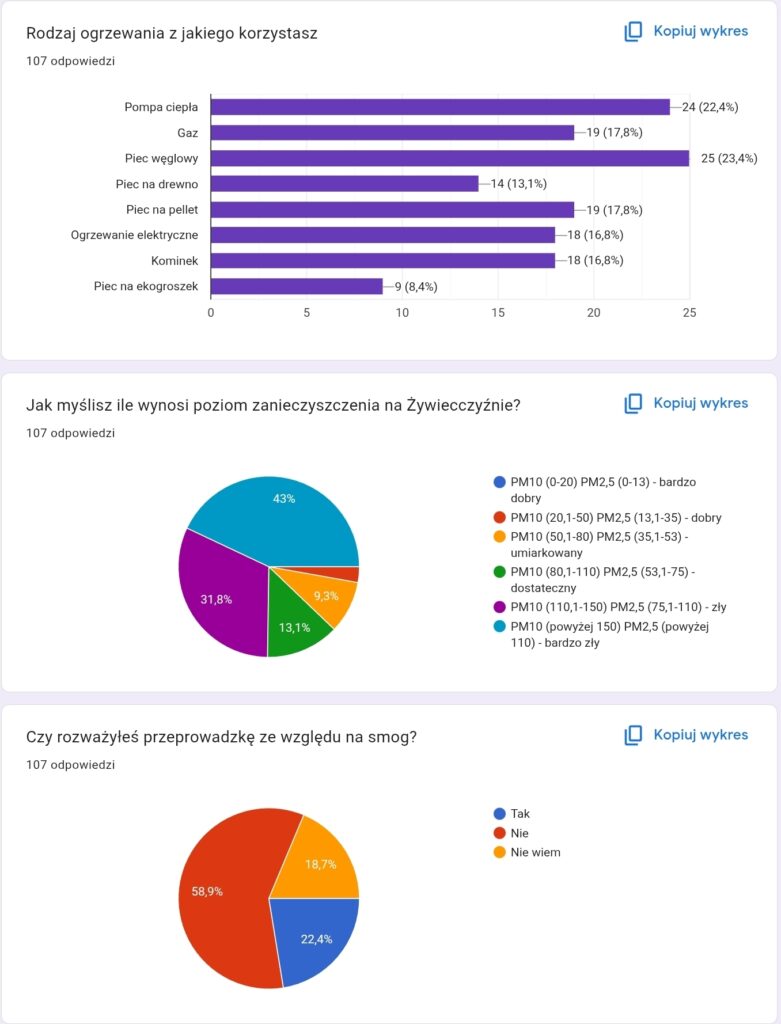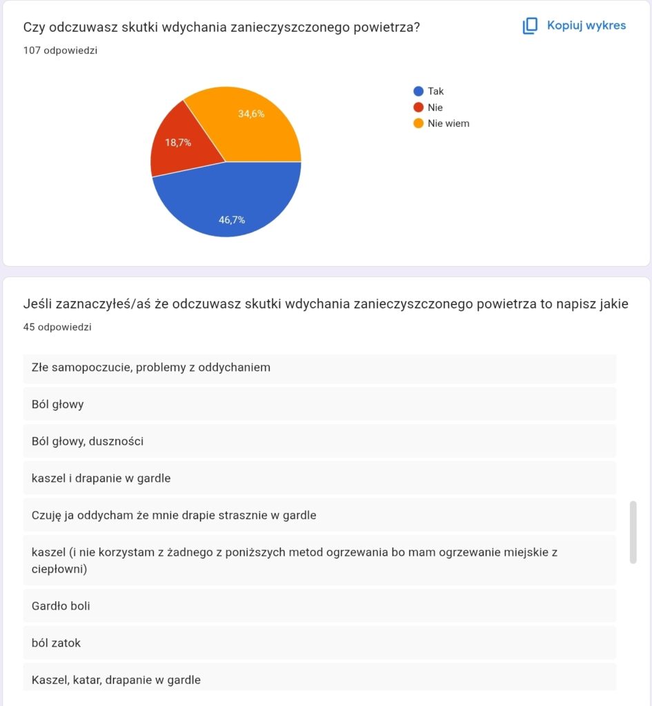​Badanie ankietowe: Przeprowadziliśmy ankietę wśród 107 mieszkańców. Dowiedzieliśmy się, że aż 46,7% z nich odczuwa skutki smogu (m.in. ból gardła, kaszel), a blisko 75% uważa jakość powietrza za złą lub bardzo złą.