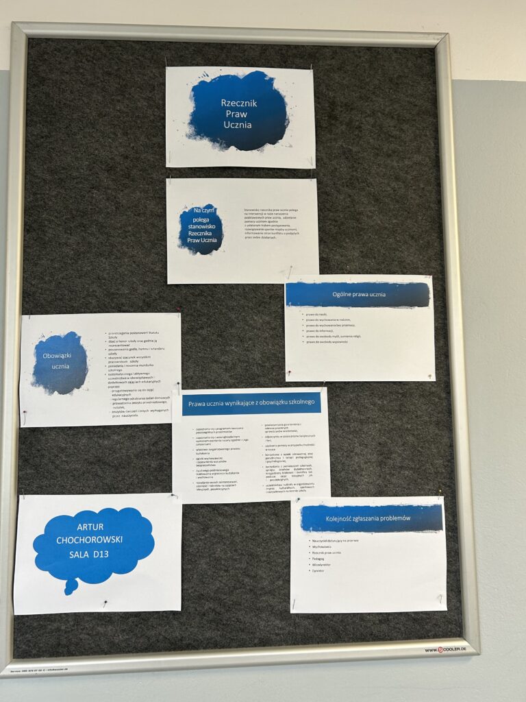 W naszej szkole istnieje od lat instytucja Rzecznika Praw Ucznia. Nasza praca (wykonane plakaty na podstawie wybranych punktów z naszego Statutu) zaowocowała pojawieniem się w szkole specjalnej przestrzeni , na której ogłoszenia publikuje nasz rzecznik.