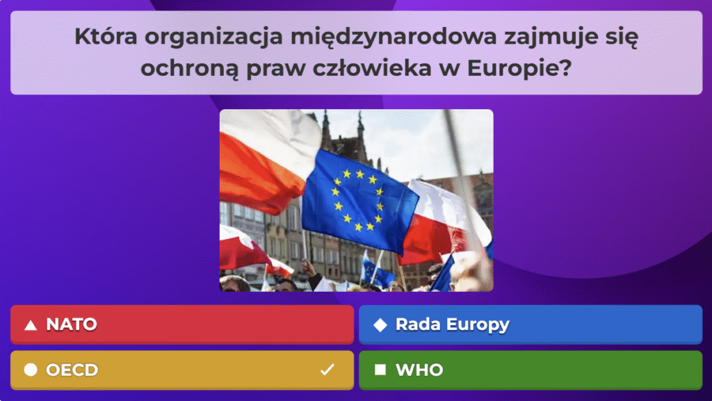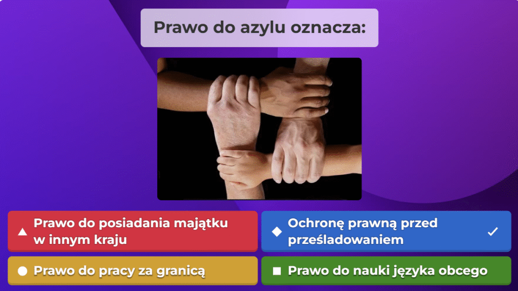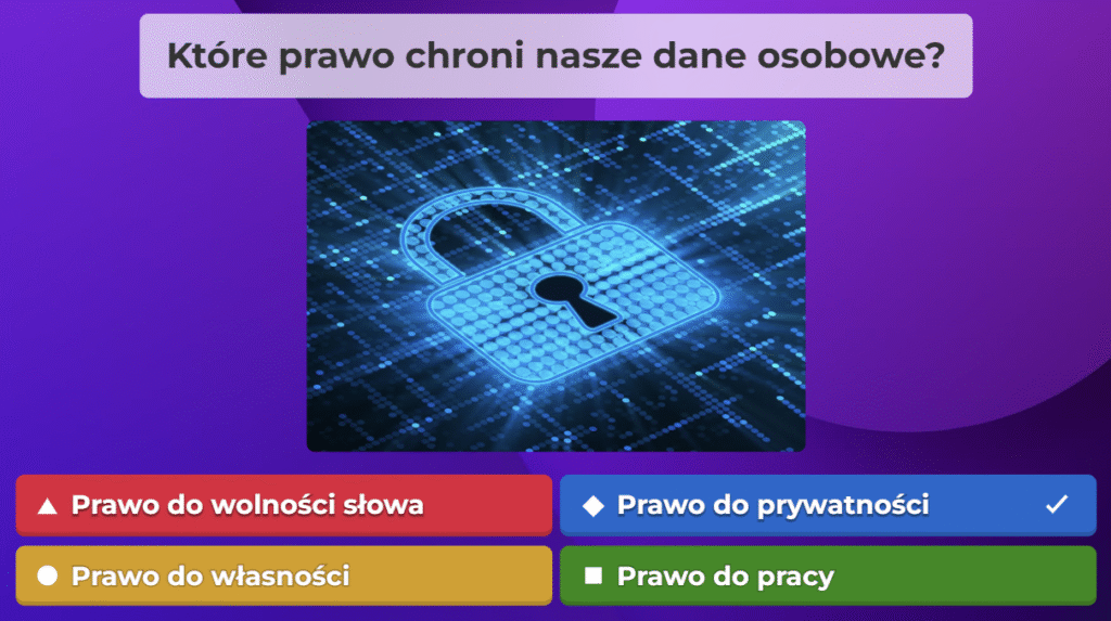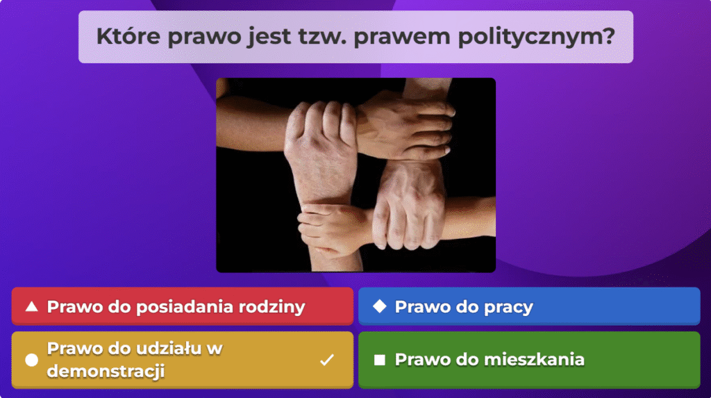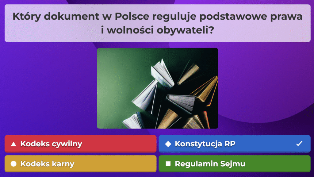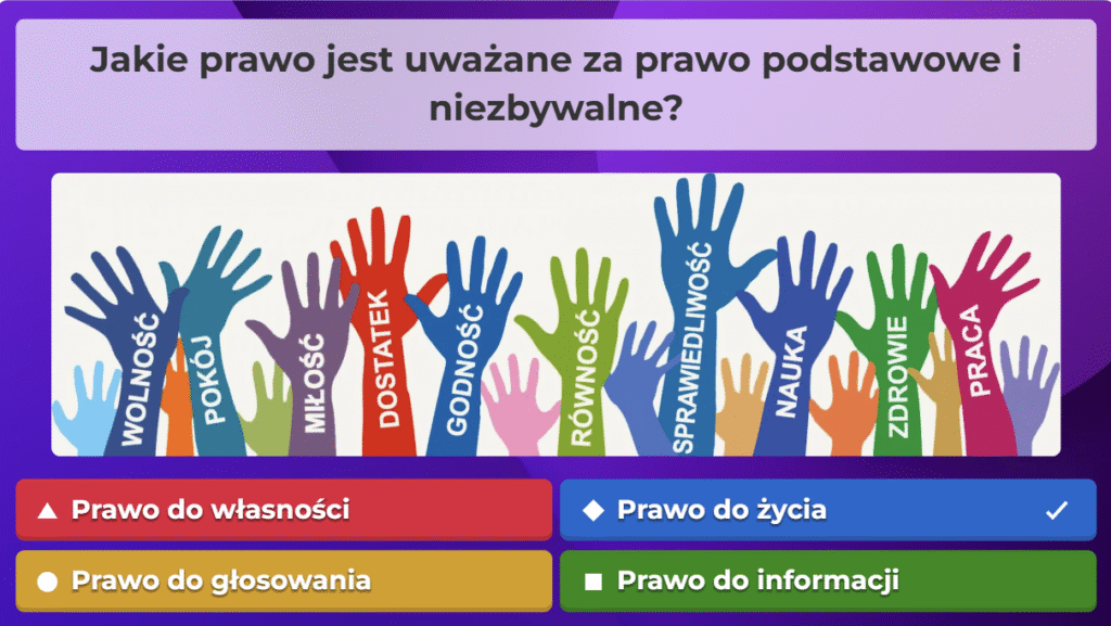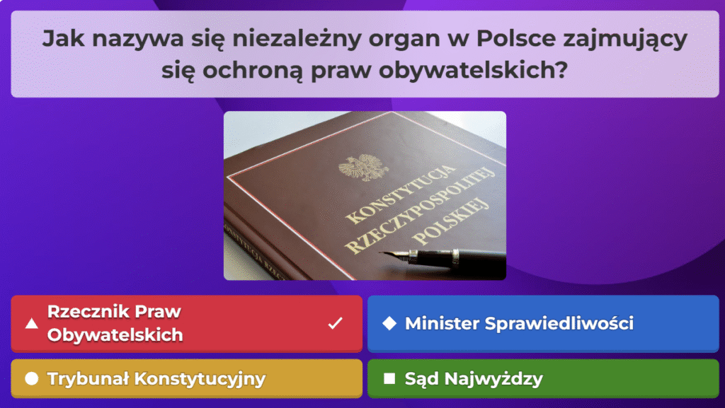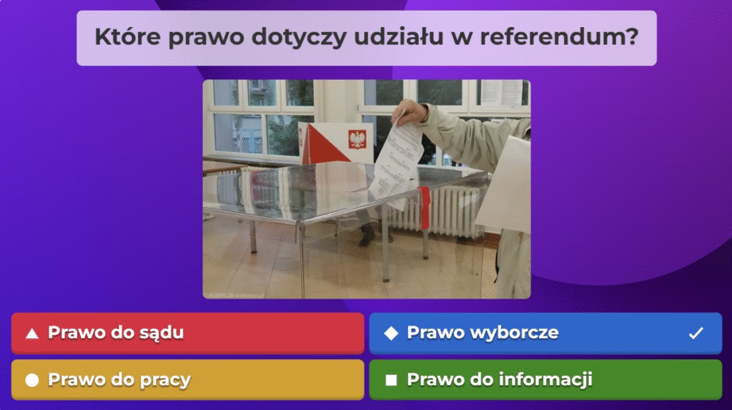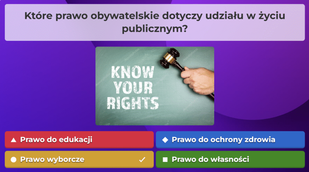 W ramach naszej akcji przygotowaliśmy quiz obywatelski na platformie Kahoot, aby w ciekawy i angażujący sposób przybliżyć uczestnikom najważniejsze zagadnienia związane z prawami i obowiązkami obywateli oraz funkcjonowaniem państwa. Zebraliśmy kluczowe informacje, opracowaliśmy pytania i stworzyliśmy interaktywną formę nauki, która pozwala sprawdzić wiedzę w przyjaznej atmosferze. Dzięki naszej współpracy i zaangażowaniu udało nam się stworzyć narzędzie, które zachęca do aktywnego uczestnictwa w życiu społecznym i rozwijania świadomości obywatelskiej.