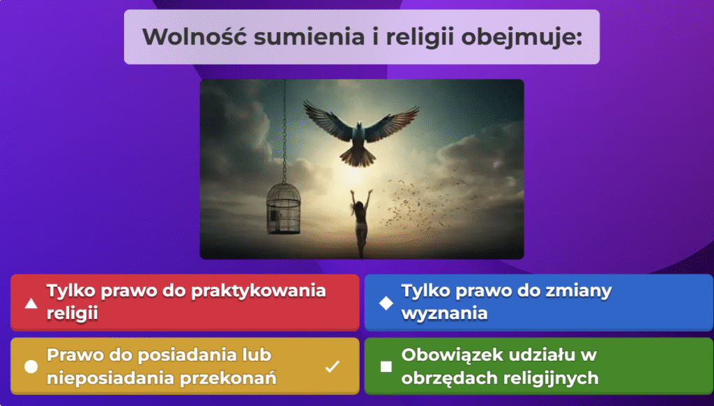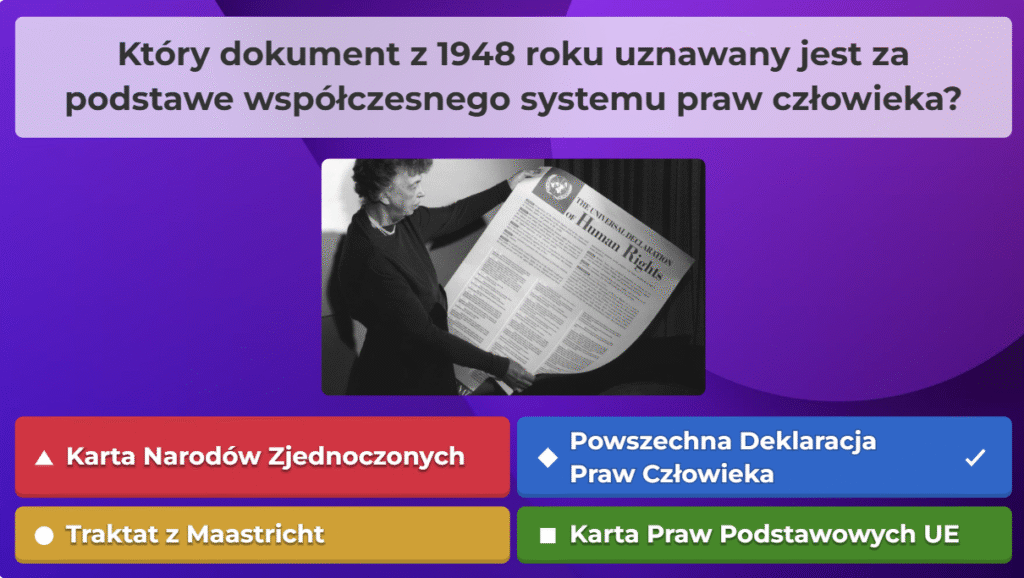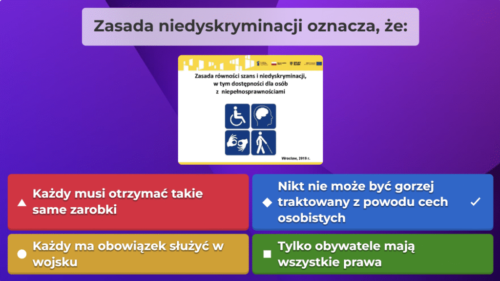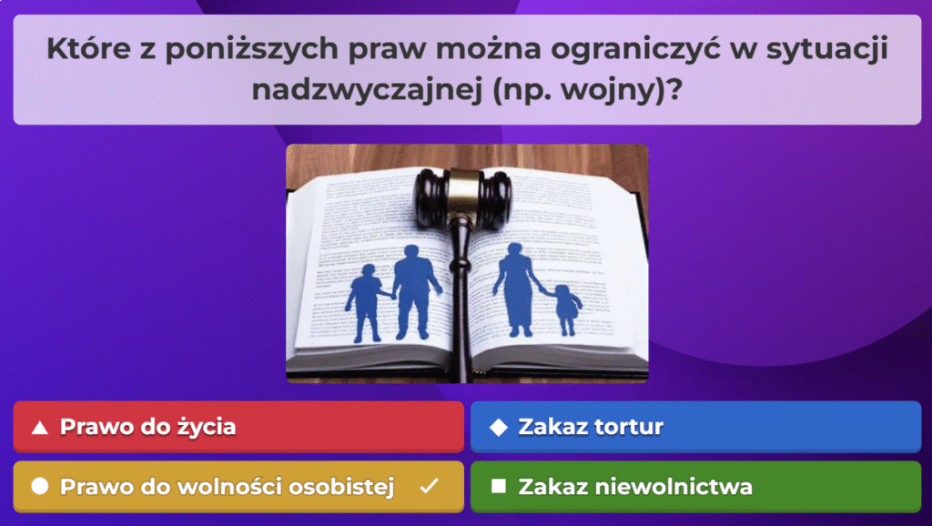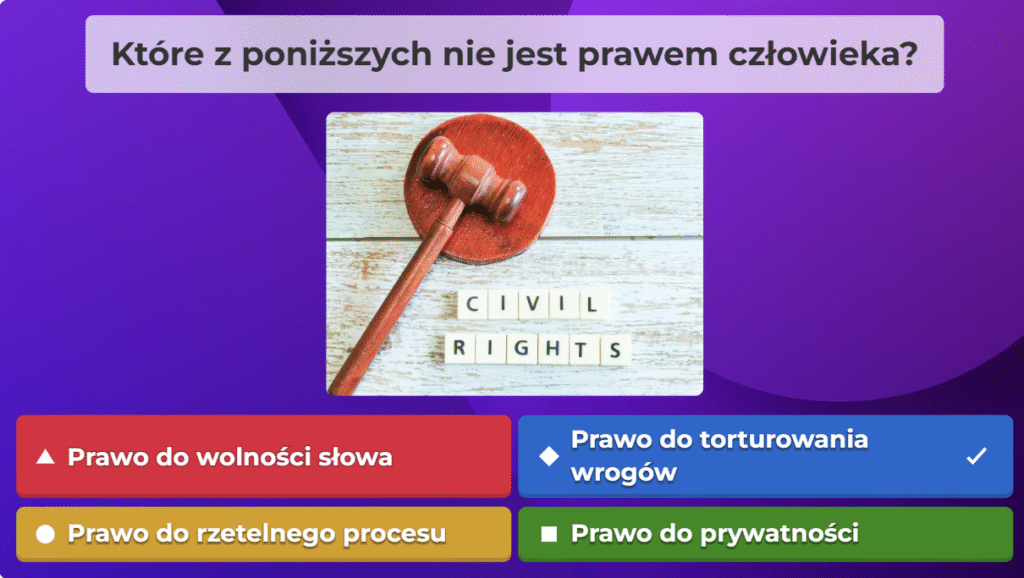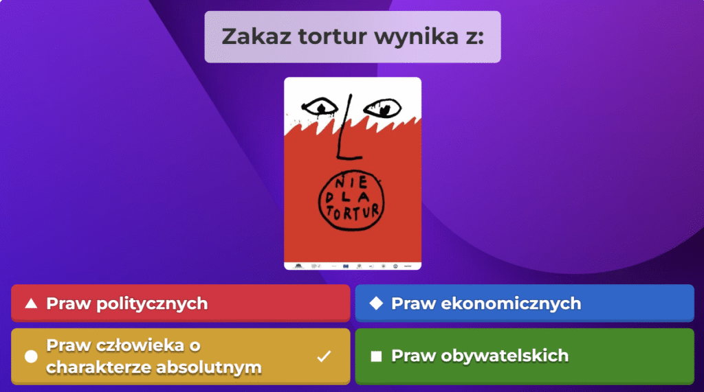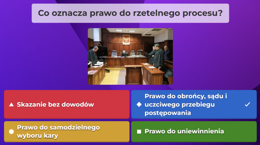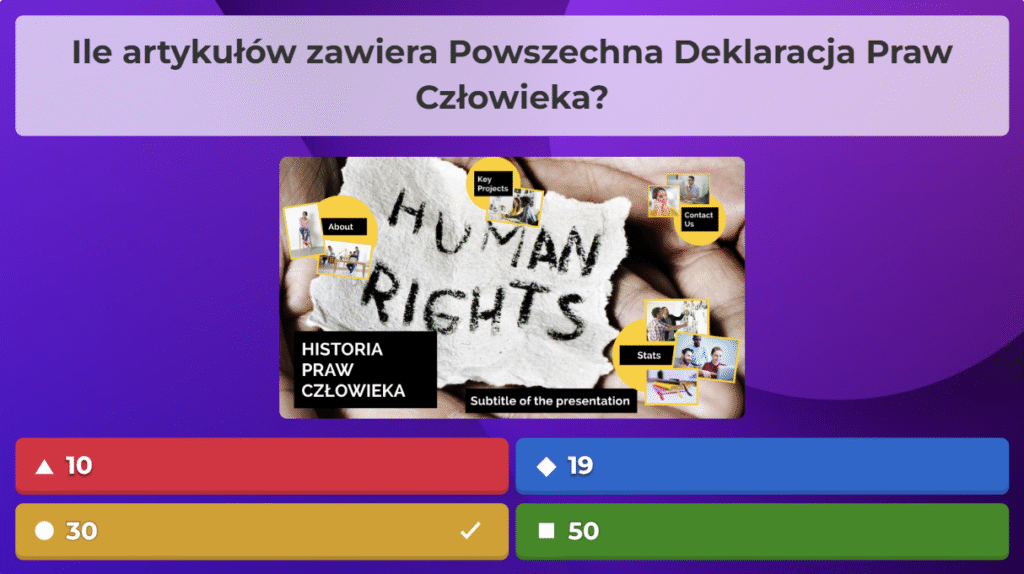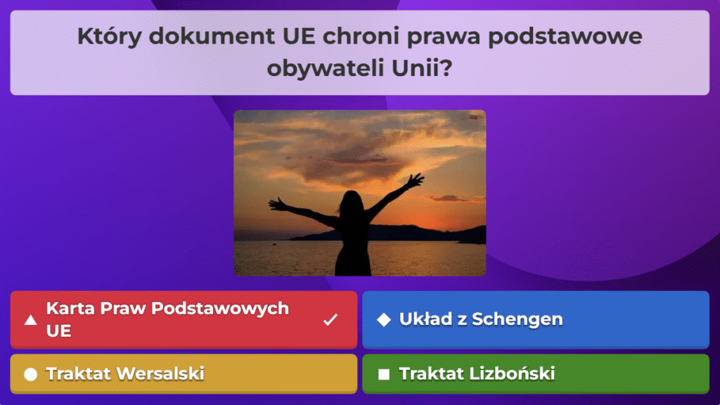 W ramach naszej akcji przygotowaliśmy quiz obywatelski na platformie Kahoot, aby w ciekawy i angażujący sposób przybliżyć uczestnikom najważniejsze zagadnienia związane z prawami i obowiązkami obywateli oraz funkcjonowaniem państwa. Zebraliśmy kluczowe informacje, opracowaliśmy pytania i stworzyliśmy interaktywną formę nauki, która pozwala sprawdzić wiedzę w przyjaznej atmosferze. Dzięki naszej współpracy i zaangażowaniu udało nam się stworzyć narzędzie, które zachęca do aktywnego uczestnictwa w życiu społecznym i rozwijania świadomości obywatelskiej.
