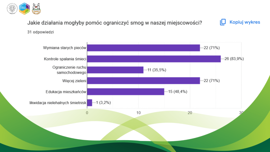 Mieszkańcy wskazali także działania, które — ich zdaniem — mogłyby poprawić jakość powietrza i zwiększyć świadomość społeczną. Do najczęściej wymienianych należały: zwiększone kontrole straży miejskiej, mające ograniczyć spalanie odpadów w piecach; dofinansowania do ekologicznych źródeł ogrzewania, takich jak pompy ciepła czy ogrzewanie gazowe; edukacja w szkołach, która uczyłaby nawyku regularnego sprawdzania jakości powietrza i reagowania na jej pogorszenie; oraz nasadzenia zieleni wzdłuż głównych dróg, które mogłyby działać jako naturalne filtry powietrza i poprawić mikroklimat.
