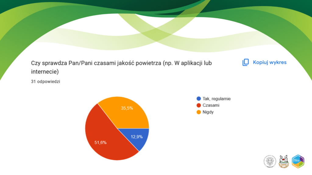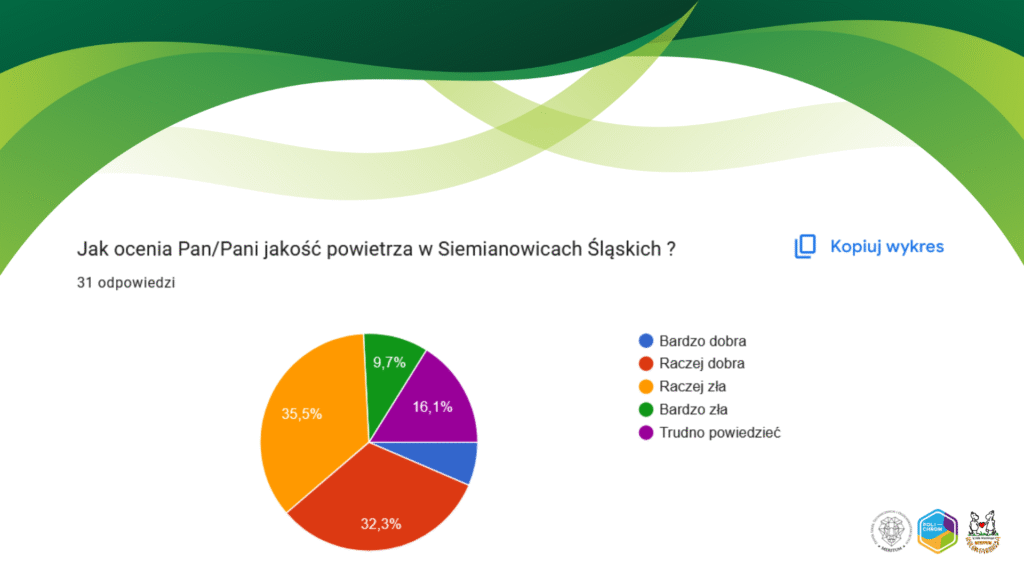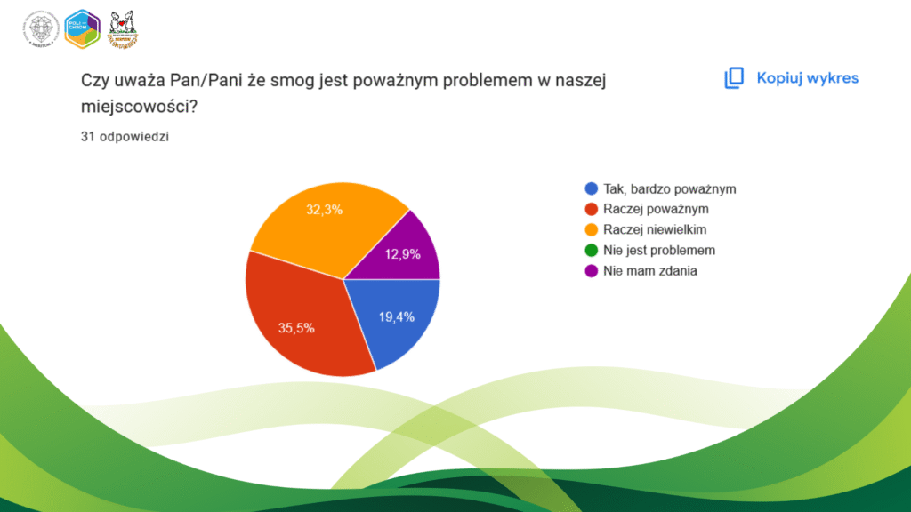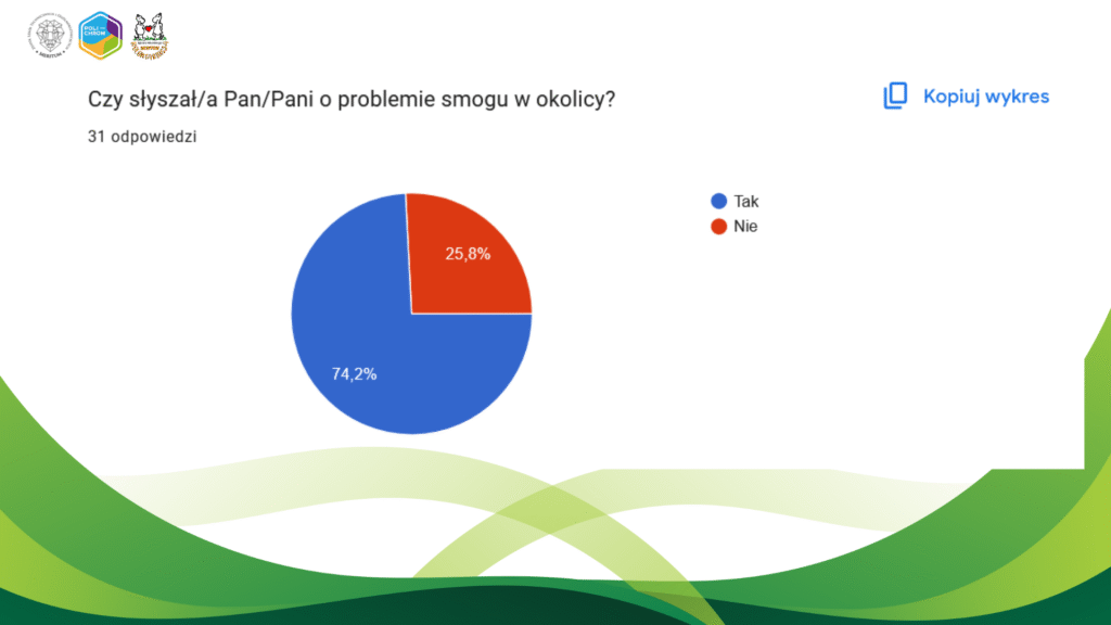 W ramach zadania przeprowadziliśmy krótką ankietę wśród 30 mieszkańców Siemianowic Śląskich, której celem było sprawdzenie lokalnej percepcji problemu smogu. 100% respondentów potwierdziło, że smog występuje w ich najbliższej okolicy. Mieszkańcy najczęściej określali jakość powietrza jako „duszącą” i „śmierdzącą”, szczególnie w godzinach wieczornych, co wskazuje na codzienny i odczuwalny charakter tego problemu.