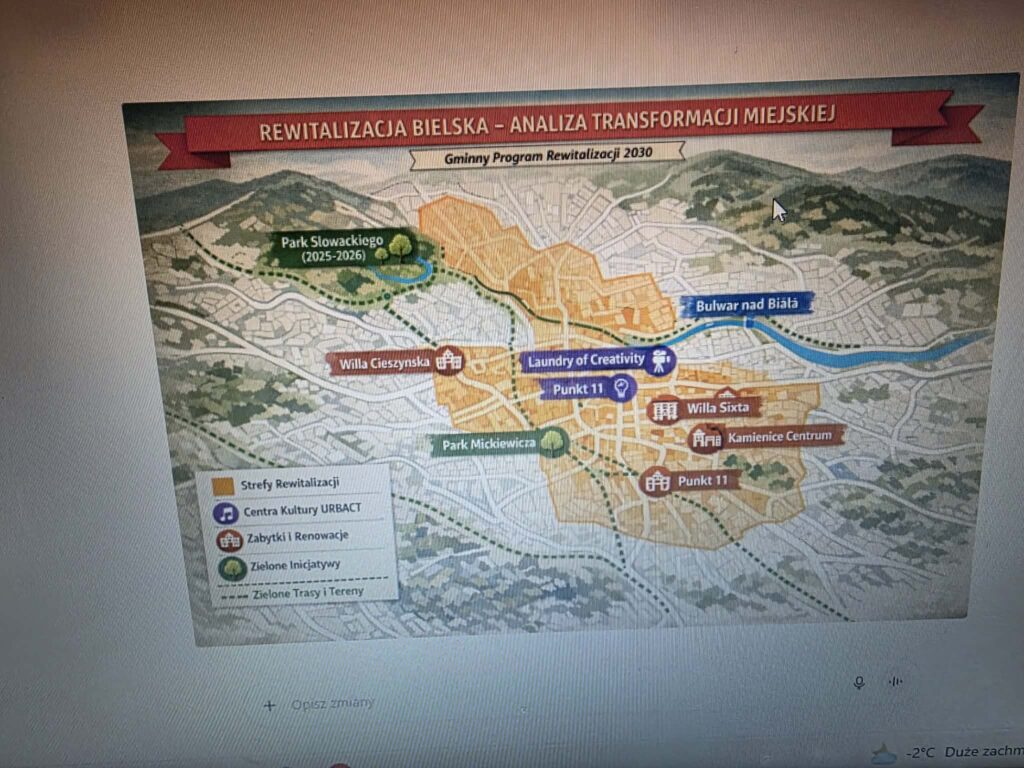 Realizacja zadania rozpoczęła się od zebrania materiałów źródłowych, w tym zdjęć przedstawiających wybrane obszary Bielska-Białej (parki, centra miasta, obiekty zabytkowe i przestrzenie publiczne) oraz danych dotyczących rewitalizacji i zmian w infrastrukturze miejskiej. Wykorzystano informacje o zakończonych, trwających i planowanych inwestycjach, ze szczególnym uwzględnieniem Gminnego Programu Rewitalizacji 2030.