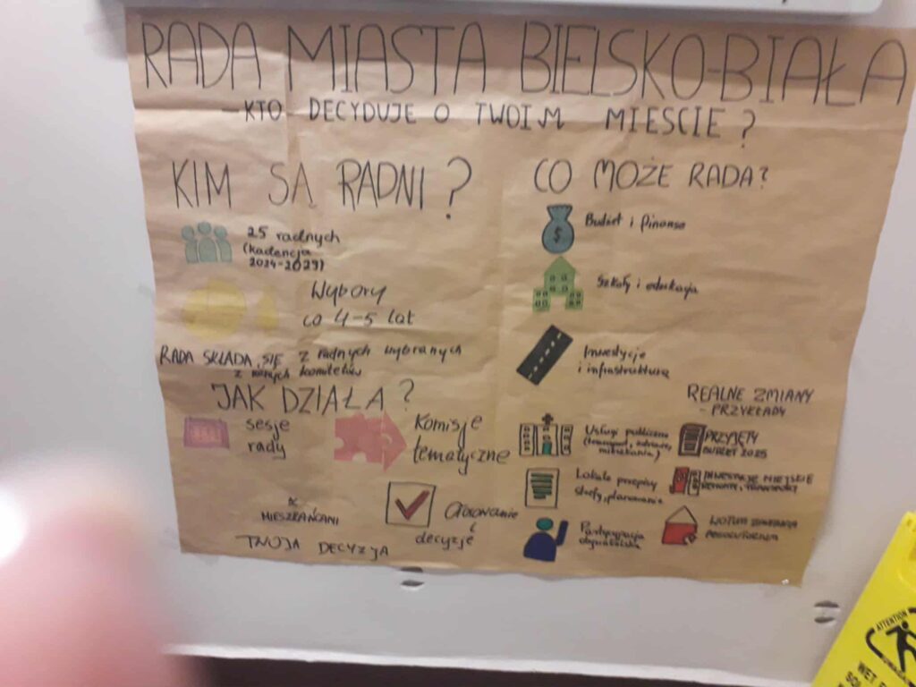 W pierwszym etapie projektu zapoznaliśmy się z funkcjonowaniem samorządu lokalnego, koncentrując się na Radzie Miejskiej Bielska-Białej. Zebraliśmy informacje dotyczące jej składu, liczby radnych, klubów politycznych oraz zasad pracy. Następnie przeanalizowaliśmy kompetencje rady – w szczególności jej wpływ na budżet miasta, planowanie przestrzenne, inwestycje i organizację usług publicznych.