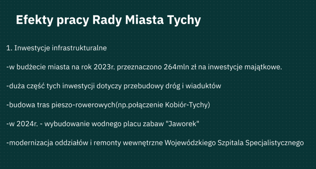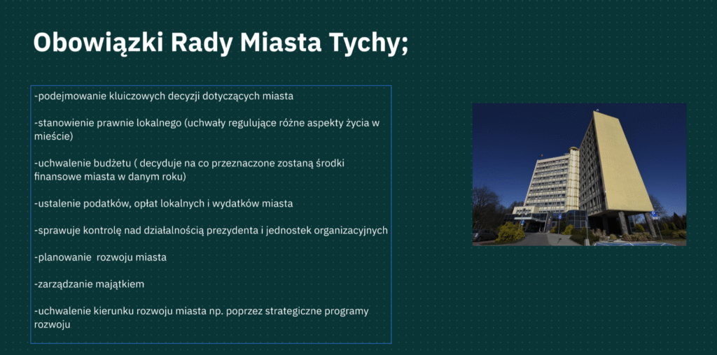 Na początku podzieliliśmy się zadaniami, żeby każdy wiedział, co robi. Później sprawdzimy podstawowe informacje na temat naszej radzie gminy: ile ma osób, czym się zajmuje i jakie uchwały podejmuje. Kolejne osoby przeglądały uchwały i dokumenty z ostatnich miesięcy, żeby znaleźć przykłady najważniejszych działań — np. inwestycje, zmiany w budżecie czy projekty dotyczące mieszkańców. Potem wybraliśmy najważniejsze rzeczy i przedstawimy je w zrozumiały sposób, żeby każdy mógł szybko ogarnąć, „kto tu rządzi” i za co odpowiada a na końcu połączyliśmy wszystko w całość.