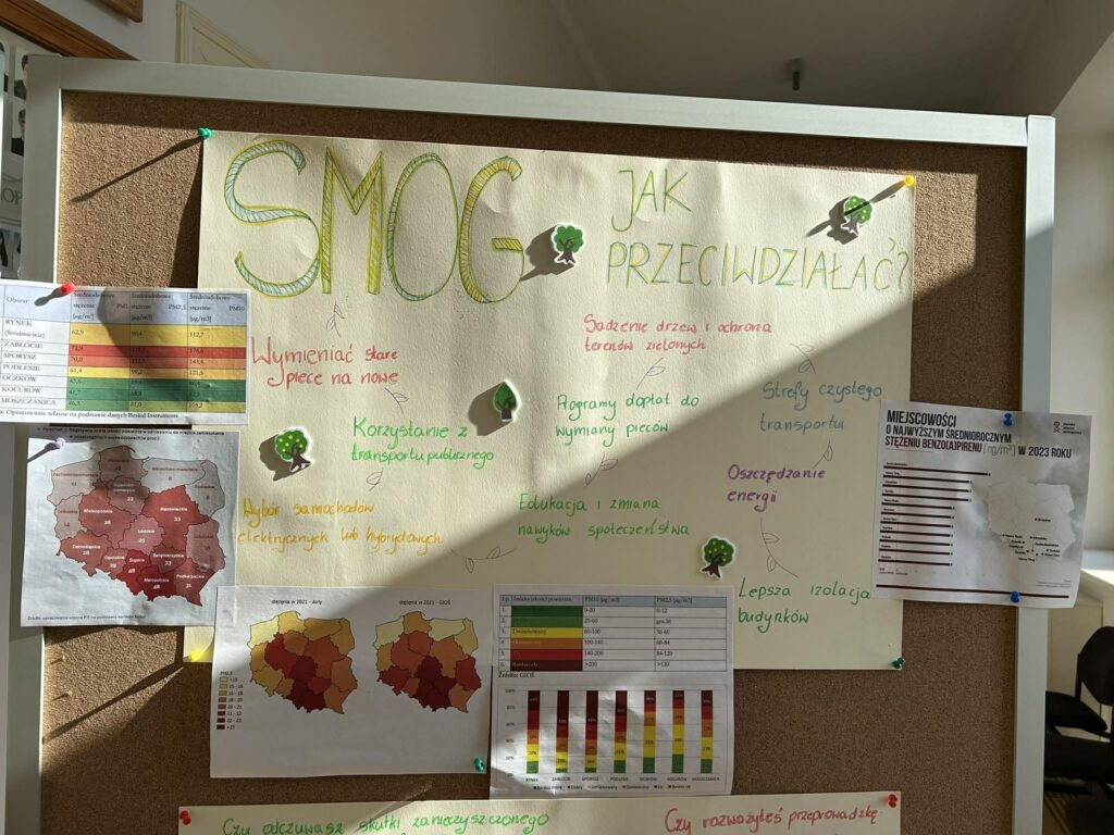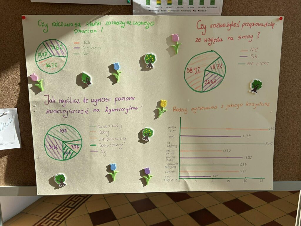 Opracowanie wyników: Stworzyliśmy czytelne infografiki w formie plakatów, które zawierają mapy smogu, wykresy słupkowe i kołowe obrazujące wyniki ankiety oraz konkretne rady, jak przeciwdziałać zanieczyszczeniom (np. wymiana pieców, termomodernizacja, korzystanie z transportu publicznego).